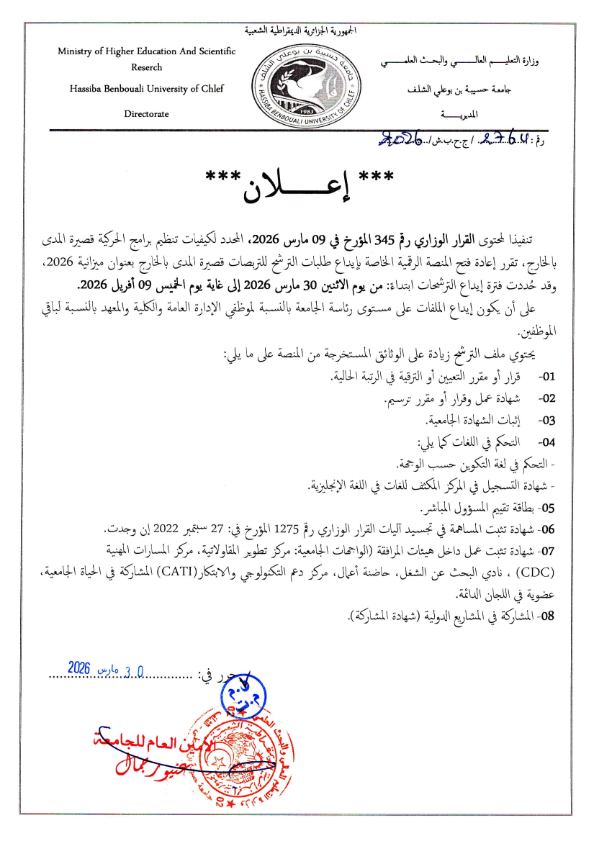 تبعًا لصدور القرار الوزاري رقم 345 المؤرخ في 09 مارس 2026، المحدد لكيفيات تنظيم برامج الحركية قصيرة المدى بالخارج، والذي جاء ليحل محل القرار رقم 255، تقرر إعادة فتح المنصة الرقمية الخاصة بإيداع طلبات الترشح للتربصات قصيرة المدى بالخارج بعنوان ميزانية سنة 2026.