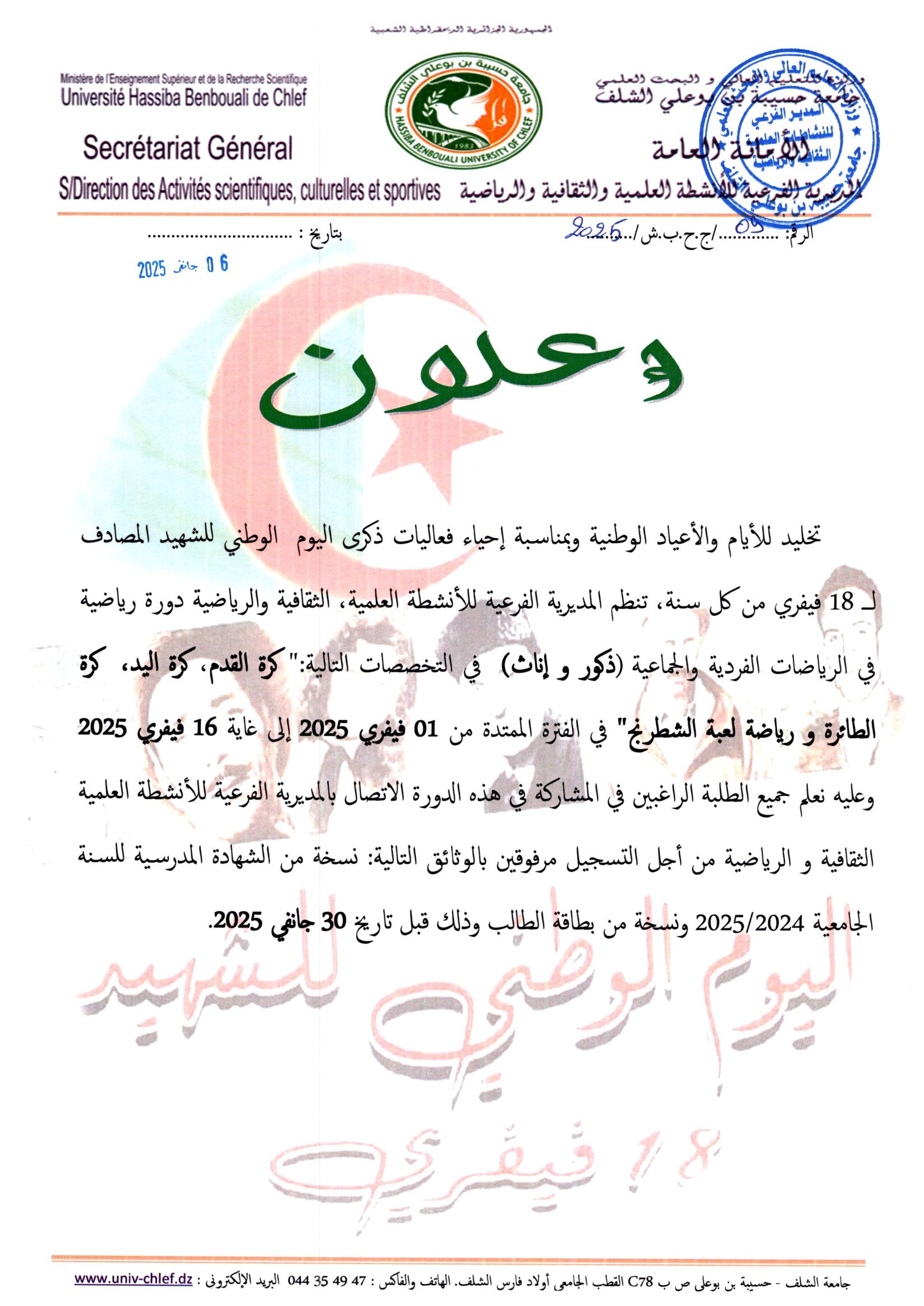 اعلان عن احياء ذكرى اليوم الوطني للشهيد18 فيفري