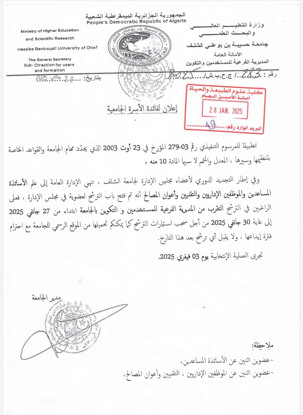إعلان لفائدة الأسرة الجامعية وإستمارة الترشح الخاصة بالأساتذة والإداريين لعضوية مجلس الادارةPar zouatenia mhamed / 28/01/2025 تحميل استمارة الترشح الخاصة بالأساتذة المساعدين لعضوية مجلس الادارة تحميل استمارة الترشح الخاصة بالموظفين لعضوية مجلس الادارة