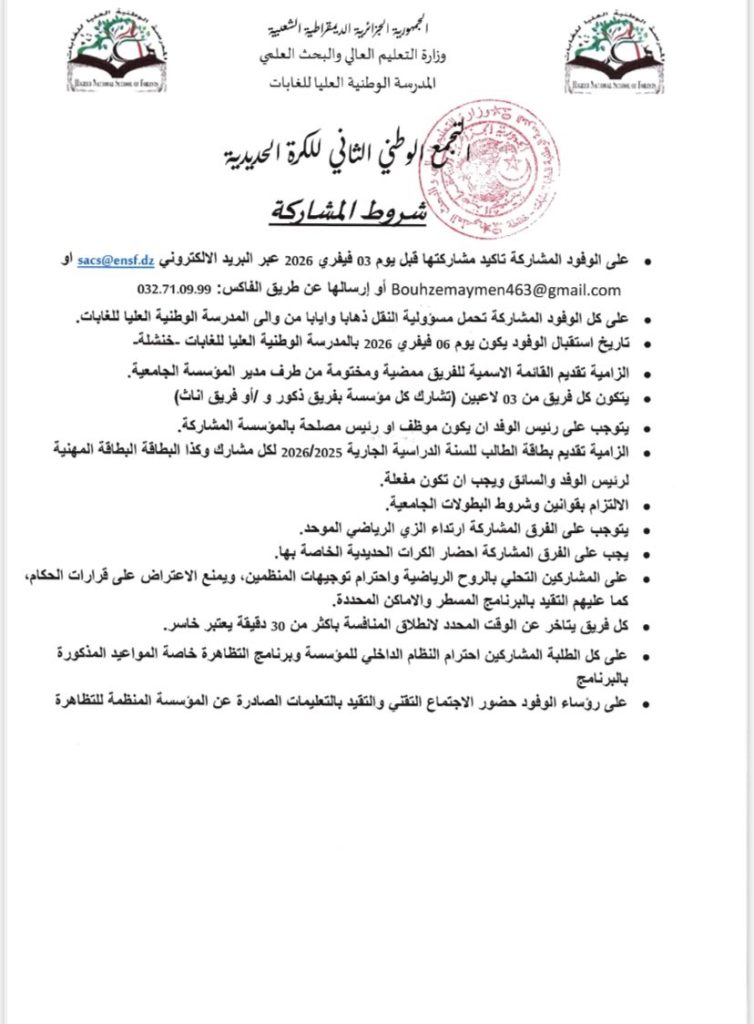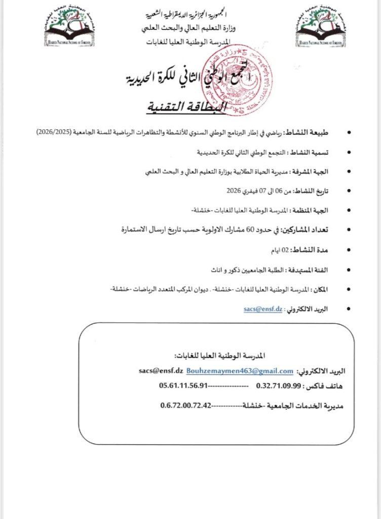 « تعلم المديرية الفرعية للانشطة العلمية الثقافية و الرياضية جميع طلبة جامعة حسيبة بن بوعلي الشلف الراغبين في المشاركة و تمثيل الجامعة في التجمع الوطني الجامعي الثاني للكرة الحديدية، والذي تنظمه المدرسة الوطنية العليا خنشلة و ذلك قبل تاريخ 03 فيفري 2026